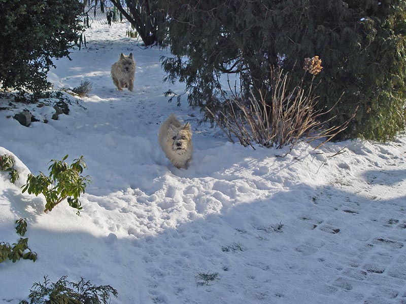 Tassja liebt den Schnee. Gutes Fell vorausgesetzt, haben Cairn Terrier auch in der kalten Jahreszeit viel Spaß draußen. Wir lassen das Fell im Winter immer etwas länger stehen. Das sieht zwar nicht ganz so ordentlich aus wie die Sommerfrisuren, aber die kleinen "Schneemonster" sollen beim Spielen ja nicht frieren. Anschließend kuscheln sie sich auf ein warmes Fellbettchen oder wärmen sich ihre Bäuchlein auf der Fußbodenheizung.